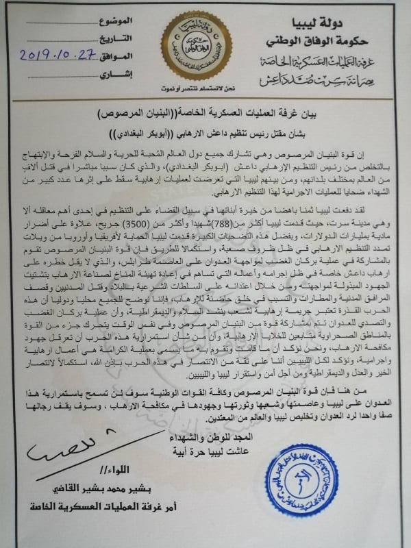 إن قوة البنيان المرصوص وهي تشارك جميع دول العالم المُحبة للحرية والسلام الفرحة والابتهاج، بالتخلص من رئيس التنظيم الإرهابي داعش (أبوبكر البغدادي)، والذي كان سببًا مباشرًا في قتل آلاف من العالم بمختلف بلدانهم، ومن بينهم ليبيا التي تعرضت لعمليات إرهابية سقط على إثرها عدد كبير من الشهداء ضحايا للعمليات الإجرامية لهذا التنظيم الإرهابي.
