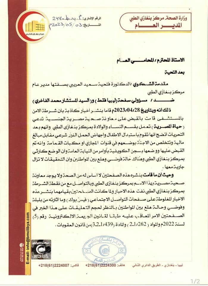 وكانت صفحة «ليبيا فقط» نشرت خبرا مفاده قيام أمن المركز بالقبض على المعاونة الصحية من الجنسية المصرية، تقوم باستبدال الأطفال وتجهض الحمل غير الشرعي.