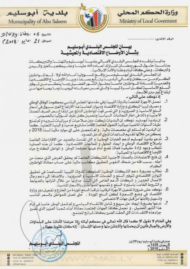 بلدي ابوسليم يُصدر بياناً بشأن الأوضاع الاقتصادية والمعيشية التي يعيشها المواطن البسيط خلال اشهر رمضان.