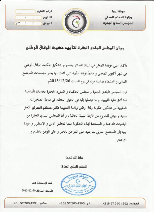 جدد المجلس البلدي الجفرة، تأييده لحكومة الوفاق الوطني، التي توصلت إليها الأطراف السياسية بالصخيرات المغربية برئاسة “فايز السراج.