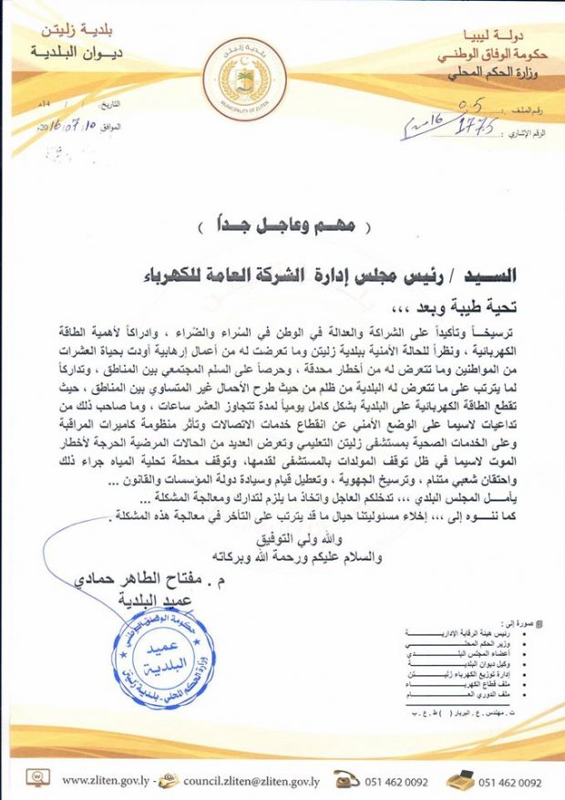 خاطب عميد بلدية زليتن السيد مفتاح حمادي (في بيان رسمي) رئيس مجلس إدارة الشركة العامة للكهرباء حول انقطاع الكهرباء على بلدية زليتن لمدة تصل الى 10 ساعات يومياً.