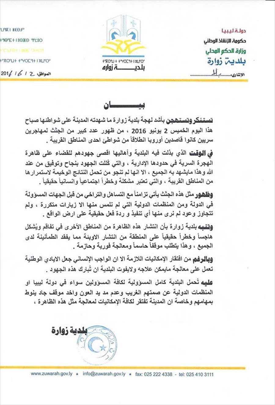 استهجن بلدي زوارة اليوم ظهور جثث مهاجرين غير شرعيين بأحد شواطئ المدينة، نتيجة غرق مركبهم الذي كانوا يستقلونه بعدما انطلق من إحدى المدن المجاورة قاصدًا أوروبا.