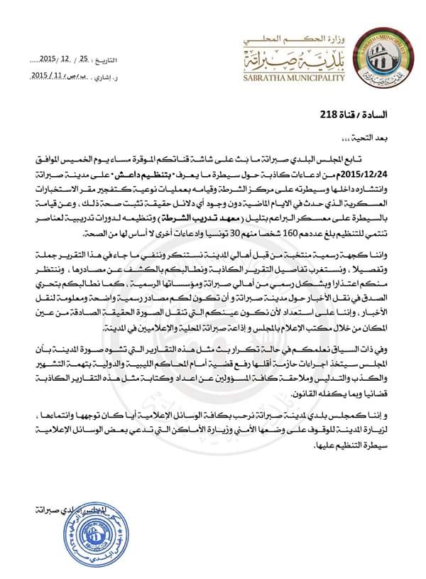 وطالب المجلس في بيانه، أن تقوم قناة 218، بتحري الدقة والمصداقية في نشر أخبارها حول مدينة صبراتة، محذراً من بث مثل هذه التقارير التي تشوه المدينة، بحسب البيان.
