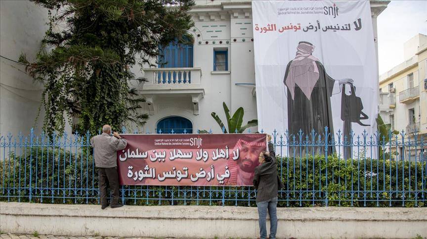 وقام المحتجون برفع شعارات ضد زيارة بن سلمان خلال تجمعهم بشارع الحبيب البورقيبة الرئيسي بالعاصمة تونس ، ورددوا هتافات :