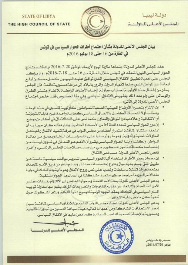 - يجدد المجلس الأعلى للدولة دعوته لأعضاء مجلس النواب الداعمين للاتفاق السياسي لمناقشة سبل إنجاز الاستحقاقات المشتركة ومن أهمها ما تعانيه هيئة صياغة الدستور من تجاوزات قانونية ودستورية بالإضافة لتسمية المناصب السيادية كما نصَّ عليها في الاتفاق السياسي”.
