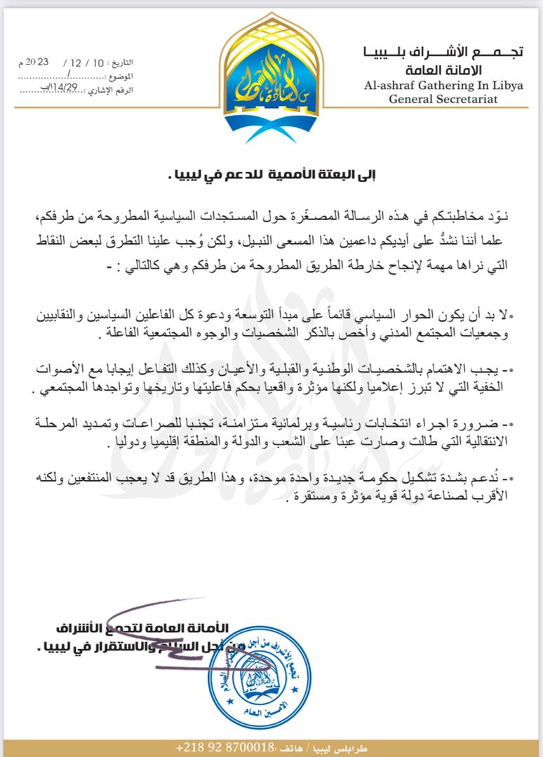كما أكد تجمع أشراف ليبيا على دعمه وبشدة تشكيل حكومة جديدة واحدة موحدة، مشيراً إلى أن هذا الطريق قد لا يعجب المنتفعين ولكنه الأقرب لصناعة دولة قوية مؤثرة ومستقرة.