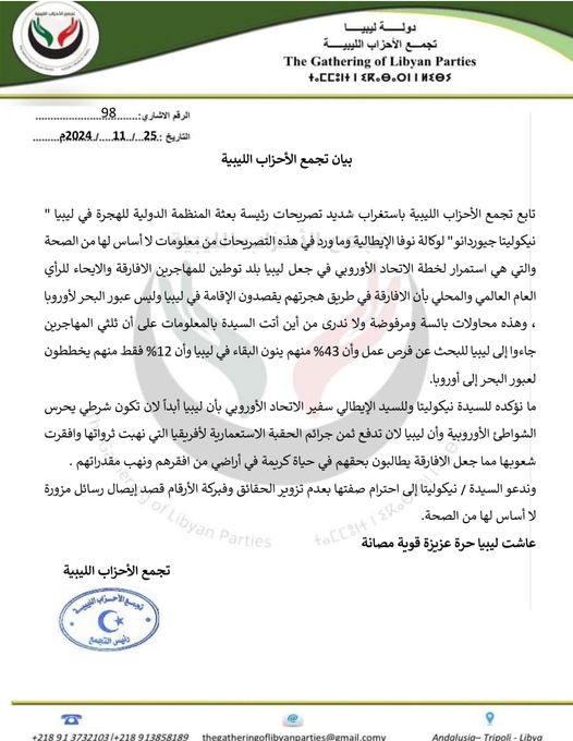 أصدر تجمع الأحزاب الليبية بياناً حول تصريحات رئيسة بعثة المنظمة الدولية للهجرة في ليبيا “نيكوليتا جيوردانو”.