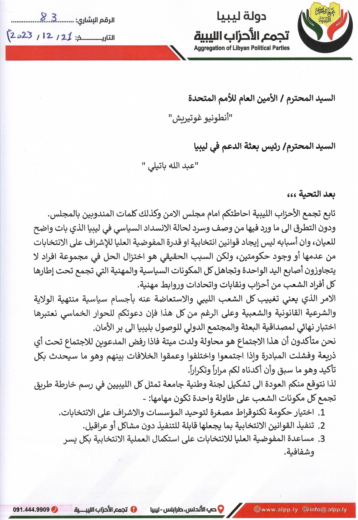 جاء ذلك في رسالة وجهها التجمع إلى الأمين العام الأمم المتحدة أنطونيو غوتيريش ومبعوثه الخاص إلى ليبيا عبد الله باتيلي، تحصلت “عين ليبيا” على نسخة منها.