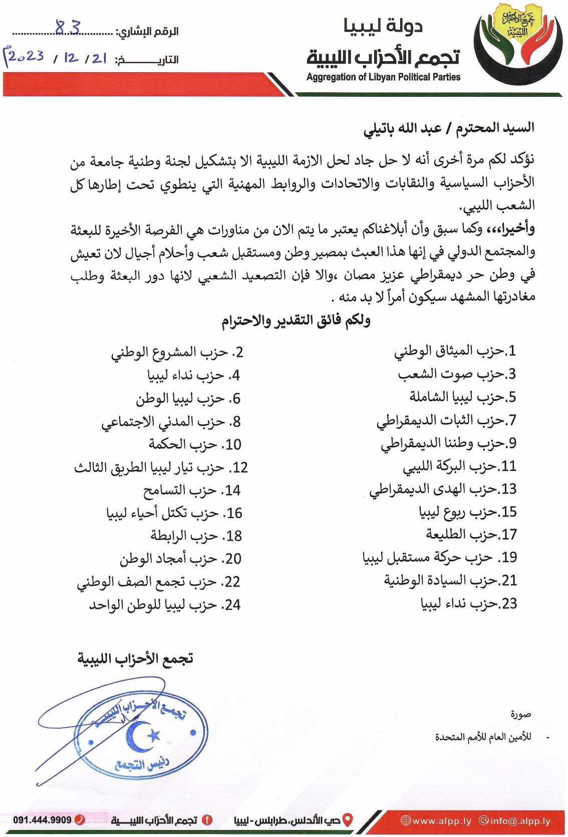 وجدد تجمع الأحزاب مطالبته بتشكيل لجنة وطنية جامعة تمثل كا الليبيين في رسم خارطة طريق تجمع كل مكونات الشعب على طاولة واحدة.