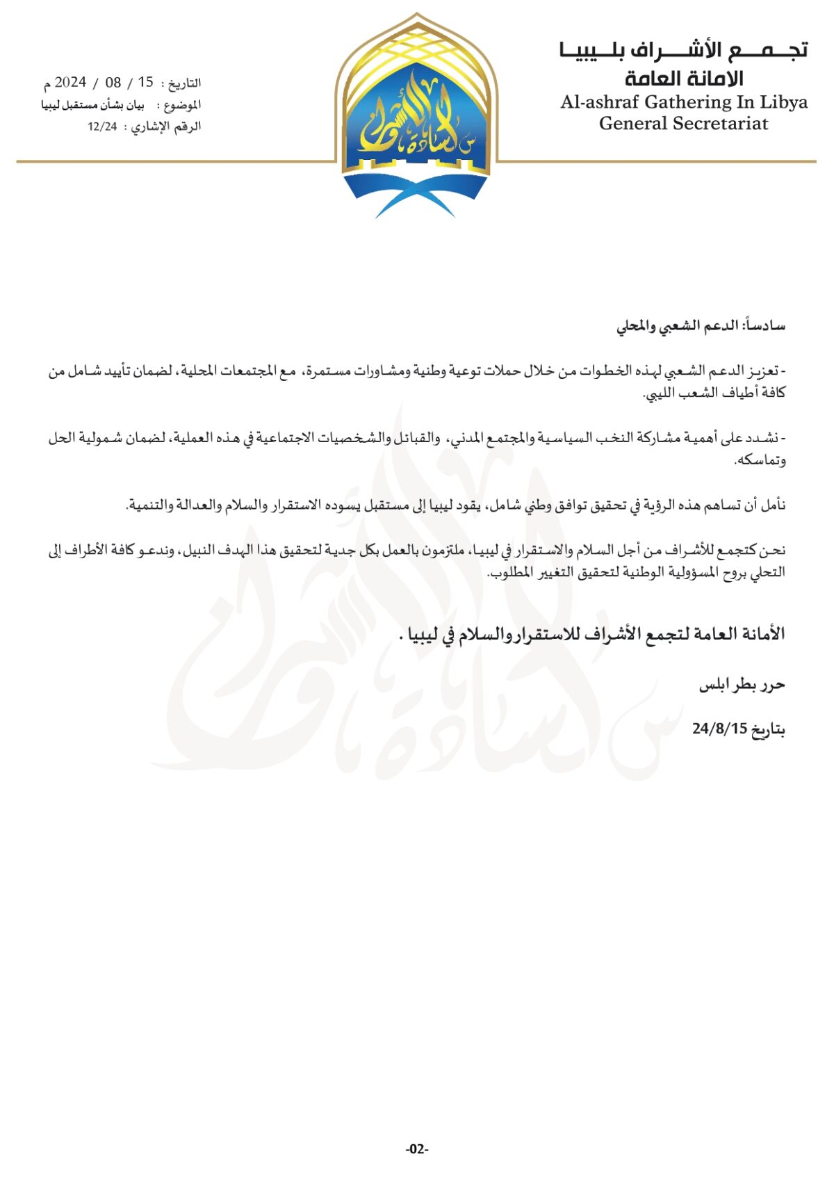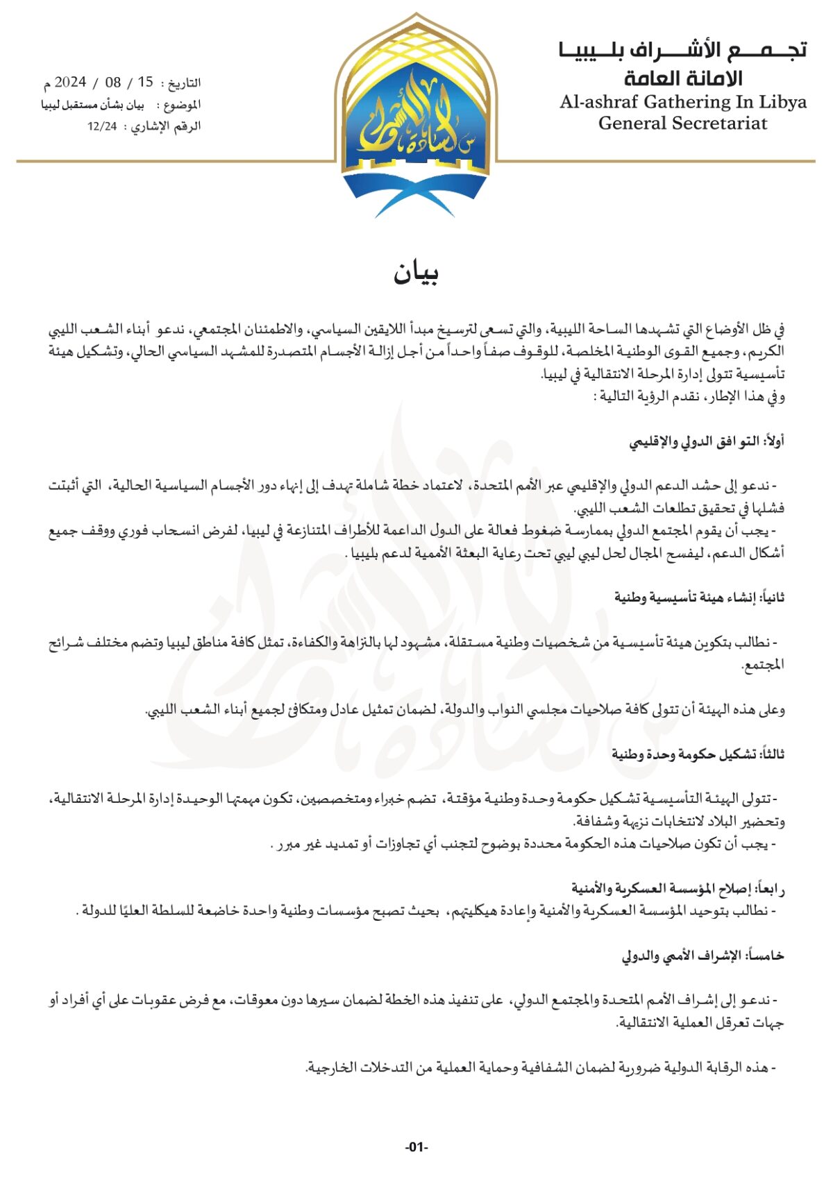 دعا تجمع الأشراف في ليبيا، أبناء الشعب الليبي وجميع القوى الوطنية للوقوف صفا واحدا من أجل إزالة الأجسام المتصدرة للمشهد السياسي الحالي، وتشكيل هيئة تأسيسية تتولى إدارة المرحلة الانتقالية في البلاد.