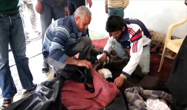 بينما تداول نشطاء سوريون صورا على وسائل التواصل توضح من قالوا إنه ضحية يخرج من فمه رغوة، ومشاهد لرجال إنقاذ يرشون أطفالا شبه عرايا بالمياه وهم يتلوون على الأرض، كما شوهدت صور لجثث أطفال من عائلة واحدة.