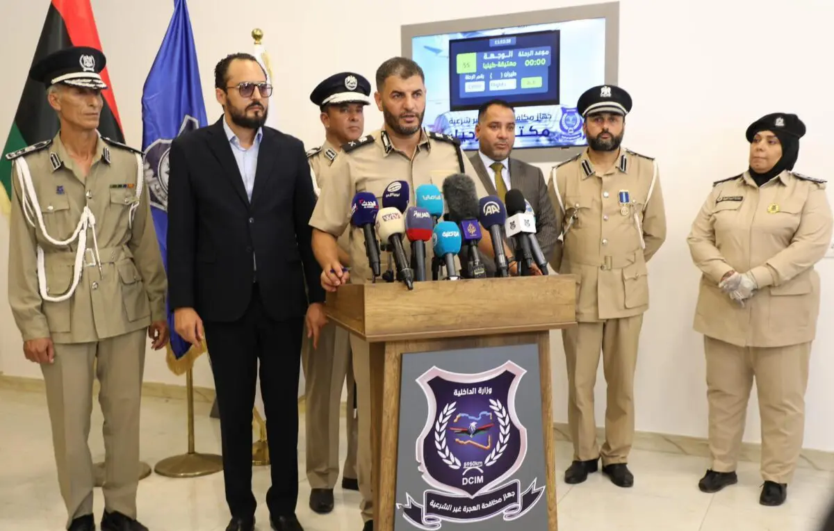 وزير الداخلية المكلف لواء عماد مصطفى الطرابلسي خلال المؤتمر الصحفي الذي عقده اليوم الاثنين بمقر جهاز مكافحة الهجرة غير…