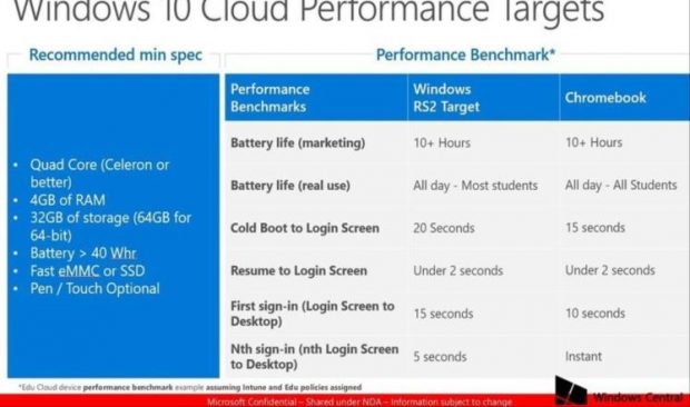 وقد حصل موقع “ويندوز سنترال” المعني بأخبار مايكروسوفت، على مستند يظهر المتطلبات الدنيا للحواسيب التي ستعمل بويندوز 10 كلاود، والتي يتبين تواضعها بما يتيح تركيب النظام على أجهزة ذات أسعار ملائمة للطلاب.