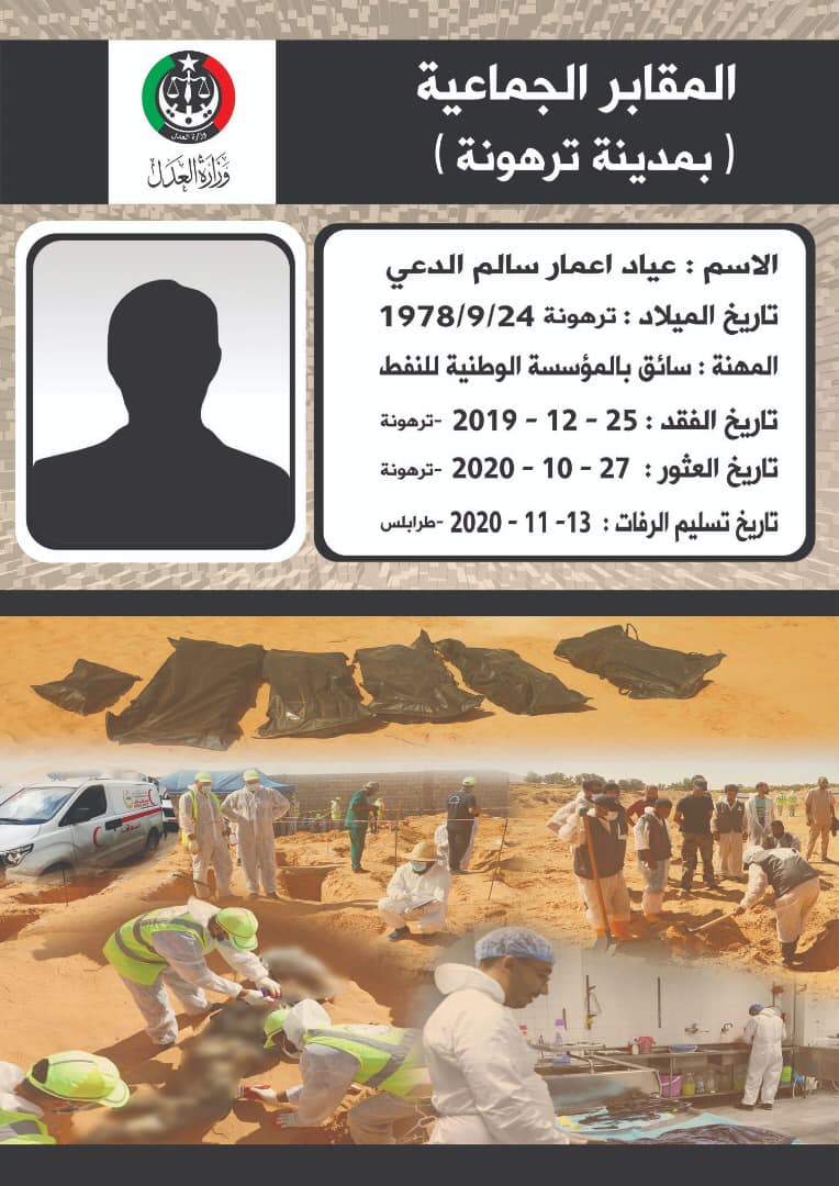 أعلنت وزارة العدل بحكومة الوفاق، أن اللجنة المُكلفة بقرار وزير العدل رقم (411) لسنة 2020 للبحث عن المقابر الجماعية بمدينة ترهونة وبإشراف من مكتب النائب العام، قامت بتسليم جثمان أحد المفقودين، الذين عُثِر عليهم في المقابر الجماعية بمشروع الربط بالمدينة، اليوم الخميس، وهي الجثة الثانية التي تم التعرف عليها وتعود للمواطن عياد اعمار سالم الدعي.