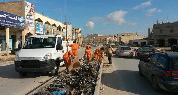 نظم موظفو ومستخدمو شركة الخدمات العامة بنغازي صياح الجمعة حملة لتنظيف الشوارع الرئيسة في منطقتي الوحيشي وسيدي يونس في بنغازي.