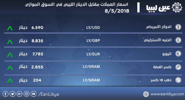 هذا وسجل سعر اليورو الأوروبي مقابل الدينار الليبي ارتفاعاً طفيفاً مع بدء تعاملات السوق الموازي وبلغ سعره اليوم «7,785» دينار ليبي مقارنة بـ «7.745» عند الإغلاق بالأمس، حيث تعرضت العملة الأوروبية في منتصف شهر يناير من هذه السنة إلى هبوط قاسي لم تشهده منذ أكثر من عام.