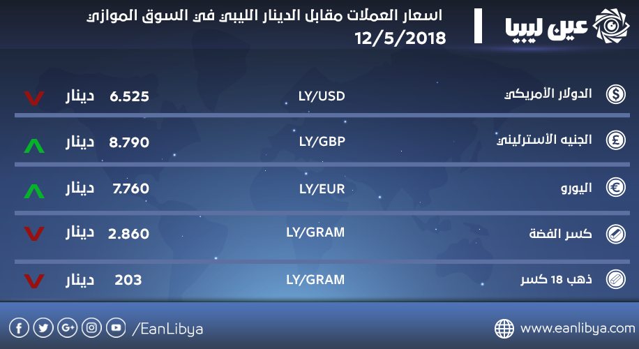 هذا وسجل سعر اليورو الأوروبي مقابل الدينار الليبي ارتفاعاً طفيفاً مع بدء تعاملات السوق الموازي وبلغ سعره اليوم «7,760» دينار ليبي مقارنة بـ «7.735» عند الإغلاق بالأمس، حيث تعرضت العملة الأوروبية في منتصف شهر يناير من هذه السنة إلى هبوط قاسي لم تشهده منذ أكثر من عام.