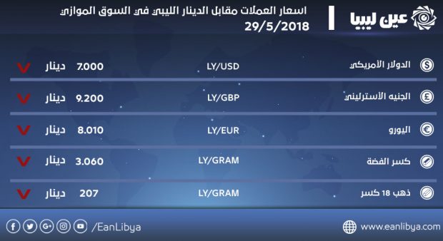 هذا وسجل سعر اليورو الأوروبي مقابل الدينار الليبي انخفاضاً طفيفاً مع بدء تعاملات السوق الموازي وبلغ سعره اليوم «8,010» دينار ليبي مقارنة بـ «8.020» عند الإغلاق بالأمس، حيث تعرضت العملة الأوروبية في منتصف شهر يناير من هذه السنة إلى هبوط قاسي لم تشهده منذ أكثر من عام.