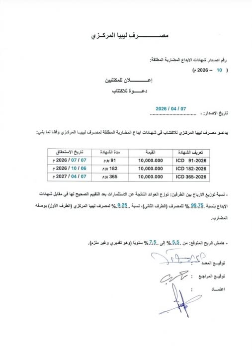 أصدر مصرف ليبيا المركزي، الخميس، دعوته للمصارف التجارية للاكتتاب في الإصدار رقم 10 لعام 2026 من شهادات الإيداع المضاربة المطلقة، وفق الإجراءات والضوابط المعتمدة في الإصدارات السابقة، وبحسب المدد وتواريخ الاستحقاق المحددة في إعلان الاكتتاب.