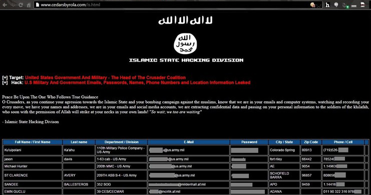 نشرت مجموعة من القراصنة الإلكترونيين التابعين لتنظيم الدولة قائمة “اغتيالات” تضم أسماء عشرات العسكريين الأمريكيين زعموا أنهم شاركوا في الغارات الجوية ضد التنظيم في سوريا والعراق.