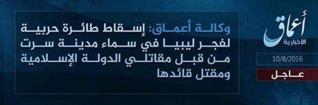 أعلنت وكالة أعماق الإخبارية التابعة لـ”تنظيم الدولة” مسؤولية التنظيم عن إسقاط طائرة مقاتلة تتبع سلاح الجو لعملية “البنيان المرصوص” في سماء سرت، كما أعلنت مقتل قائد الطائرة.