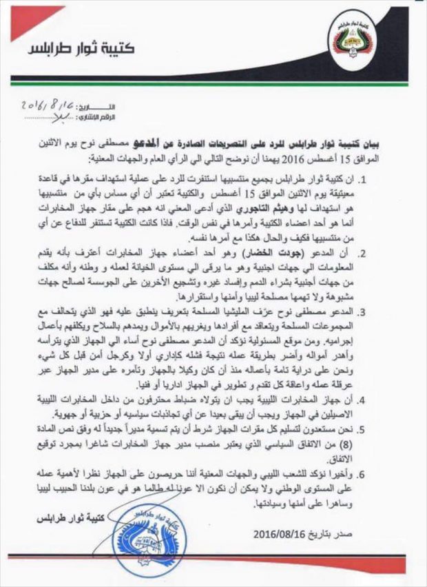 ردت كتيبة “ثوار طرابلس” في بيانٍ، على تصريحات رئيس المخابرات في طرابلس، مصطفى نوح عبر قناة 218، والتي وصف فيها الكتيبة بـ”الميليشيا”.