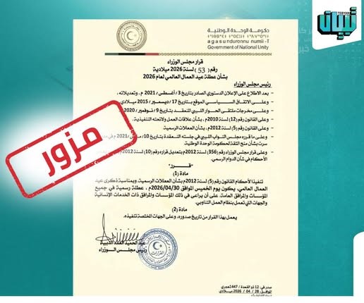 نفت منصة “تبيان” صحة ما جرى تداوله عبر مواقع التواصل الاجتماعي بشأن صدور قرار منسوب إلى رئيس حكومة الوحدة الوطنية يقضي بإعلان عطلة رسمية بمناسبة عيد العمال لعام 2026.