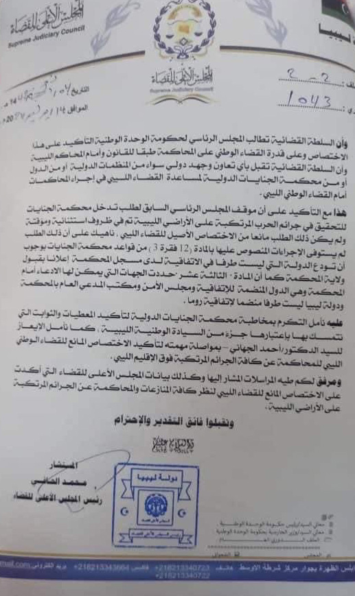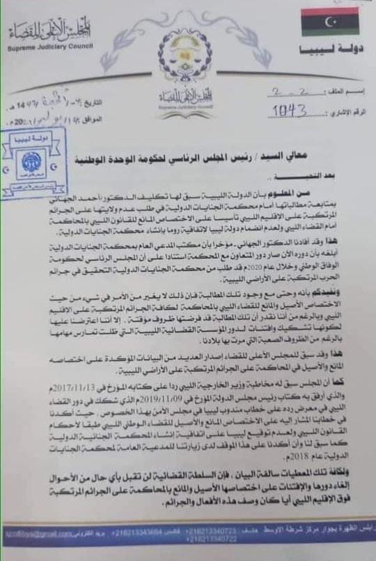 وفيما يلي صورة من كتاب رئيس المجلس الأعلى للقضاء الموجه إلى رئيس المجلس الرئاسي تحصلت “عين ليبيا” على نسخة منه: