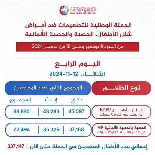 أعلن المركز الوطني لمكافحة الأمراض، في إحصائية نشرها، بعد انتهاء اليوم الرابع للحملة الوطنية للتطعيم، وصول إجمالي عدد الأطفال المطعمين في ليبيا حتى الآن، إلى 337,147 طفل وطفلة.