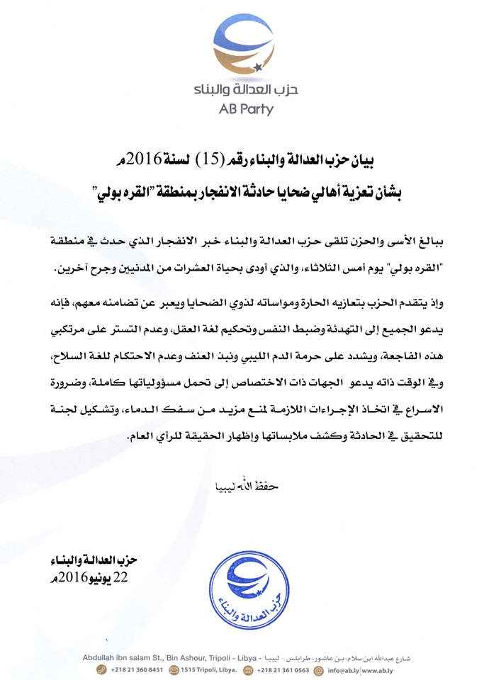 وإذ يتقدم الحزب بتعازيه الحارة ومواساته لذوي الضحايا ويعبر عن تضامنه معهم، فإنه يدعو الجميع إلى التهدئة وضبط النفس وتحكيم لغة العقل، وعدم التستر على مرتكبي هذه الفاجعة، ويشدد على حرمة الدم الليبي ونبذ العنف وعدم الاحتكام للغة السلاح.
