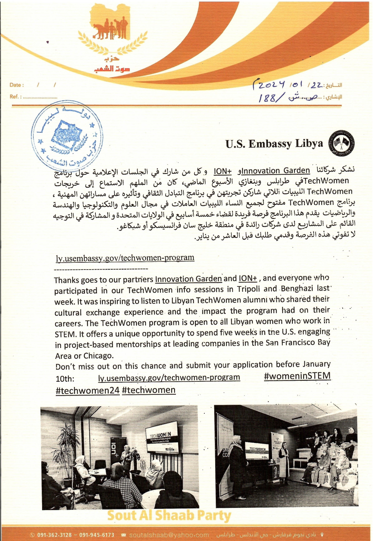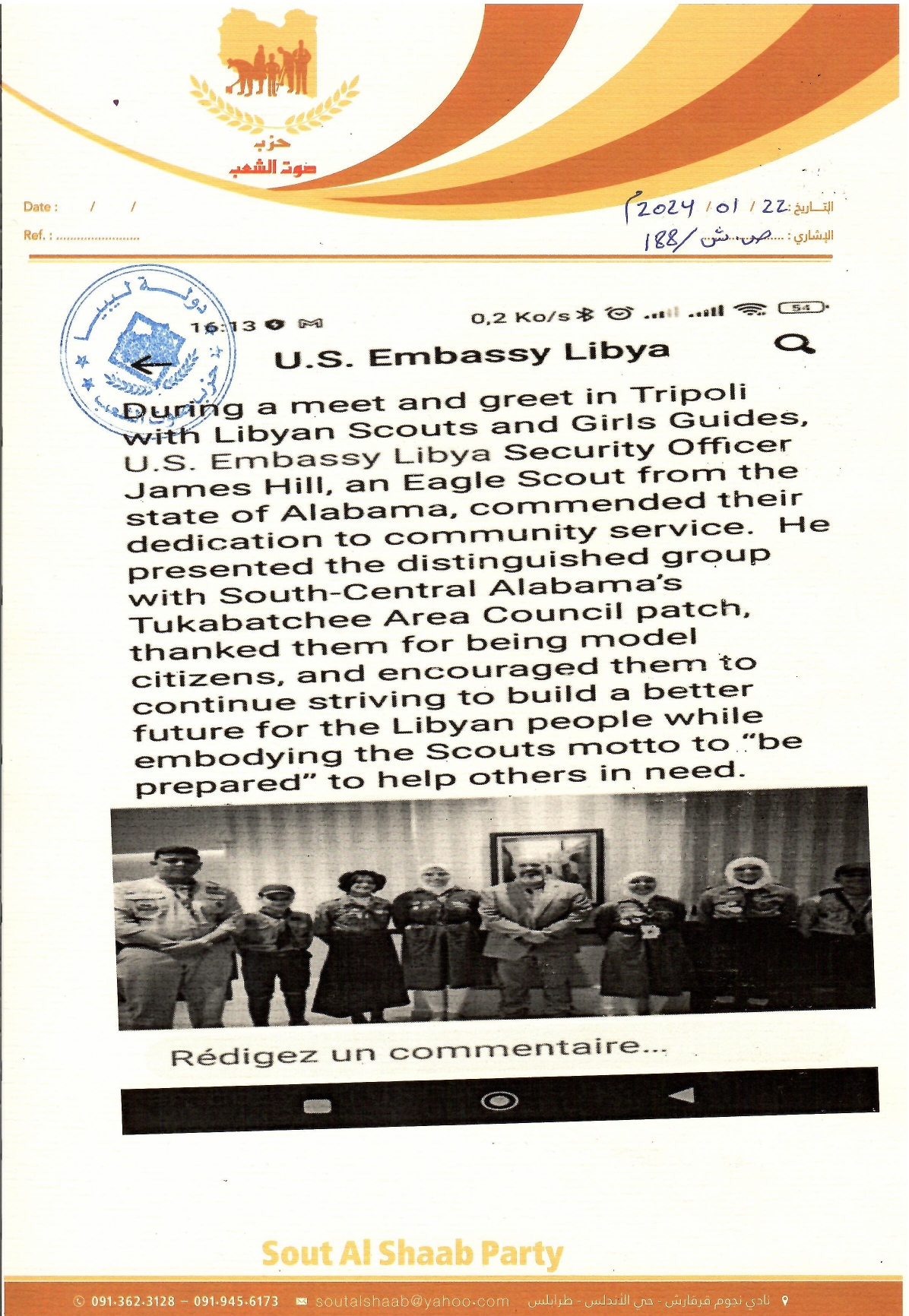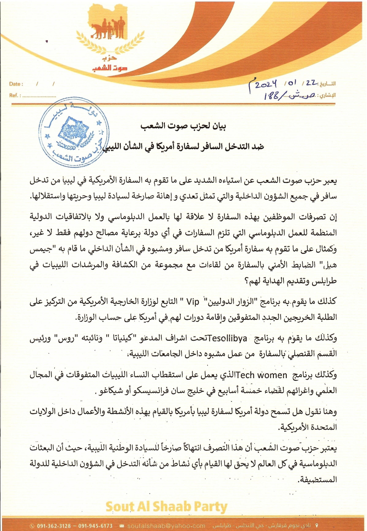 أعرب حزب صوت الشعب عن استياءه الشديد على ما تقوم به السفارة الأمريكية في ليبيا من تدخل وصفه بالسافر في جميع الشؤون الداخلية والتي تمثل تعدي وإهانة صارخة لسيادة ليبيا وحريتها واستقلالها.