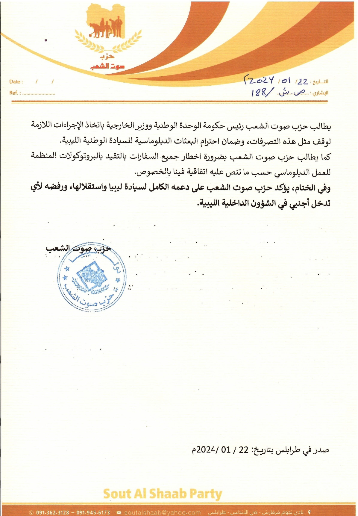 وطالب حزب صوت الشعب من رئيس حكومة الوحدة الوطنية ووزارة الخارجية باتخاذ الإجراءات اللازمة لوقف مثل هذه التصرفات، وضمان احترام البعثات الدبلوماسية للسيادة الوطنية الليبية، بالإضافة إلى إخطار جميع السفارات بالتقيد بالبروتوكولات المنظمة للعمل الدبلوماسي حسب ما تنص عليه اتفاقية فيننا بالخصوص.