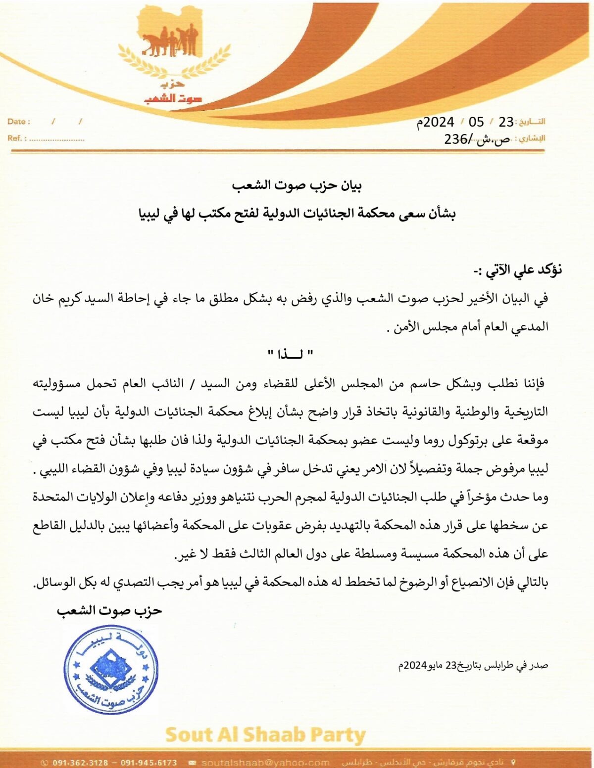 طالب حزب صوت الشعب وبشكل حاسم من المجلس الأعلى للقضاء والنائب العام بتحمل مسؤوليتهم التاريخية والوطنية والقانونية باتخاذ قرار واضح بشأن إبلاغ المحكمة الجنائية الدولية بأن ليبيا ليست موقعة على بروتوكول روما.