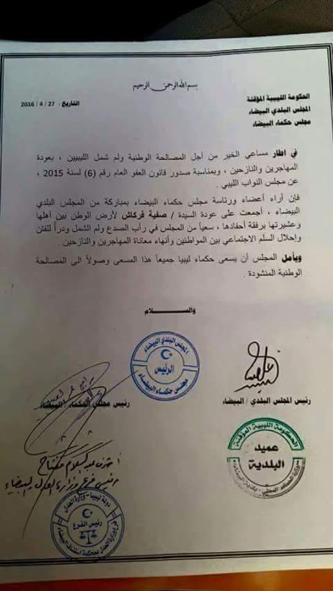 طالب المجلس البلدي البيضاء ومجلس حكماء المدينة بعودة صفية فركاش زوجة القذافي لأرض الوطن برفقة احفادها، سعيا لرأب الصدع ولم الشمل ودرأ للفتن وإحلال السلم الإجتماعي بين المواطنين وإنهاء معاناة المهاجرين والنازحين، وفقا للبيان.