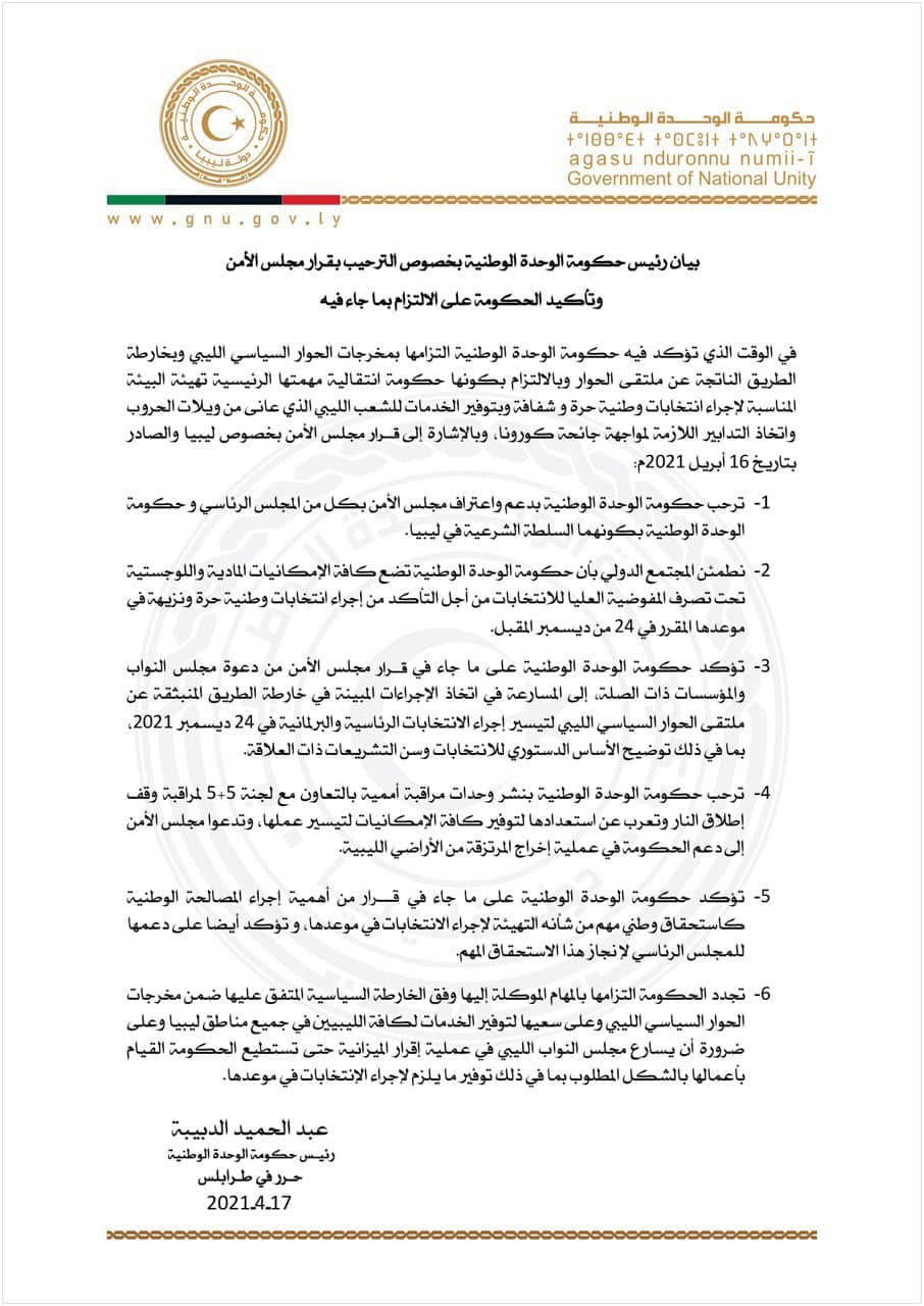 وأكد البيان على التزام حكومة الوحدة الوطنية بمخرجات الحوار السياسي الليبي وبخارطة الطريق الناتجة عن ملتقى الحوار، والالتزام بكونها حكومة انتقالية مهمتها الرئيسية تهيئة البيئة المناسبة لإجراء انتخابات وطنية حرة وشفافة، وبتوفير الخدمات للشعب الليبي الذي عانى ويلات الحروب، واتخاذ التدابير اللازمة لمواجهة جائحة كورونا، بحسب البيان.