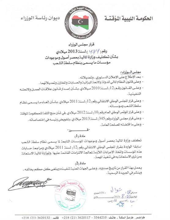كلفت رئاسة الوزراء وزارة المالية بحصر أصول وموجودات مؤسسات ما يسمى بنظام سلطة الشعب سابقا ومراجعة حسابات هذه المؤسسات.