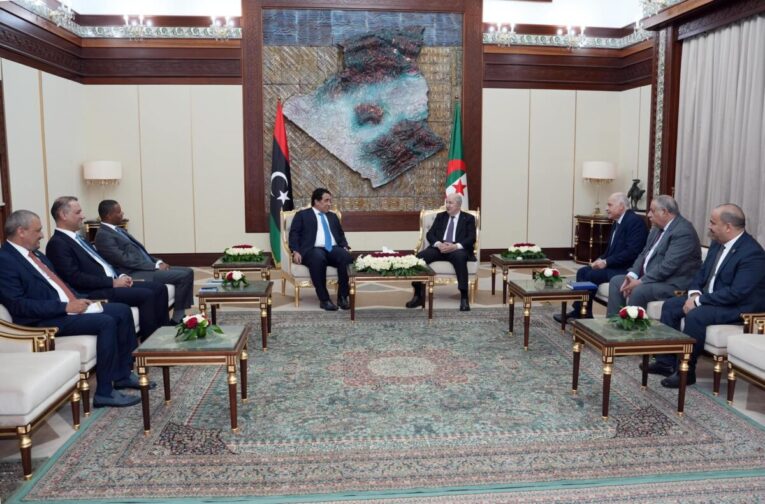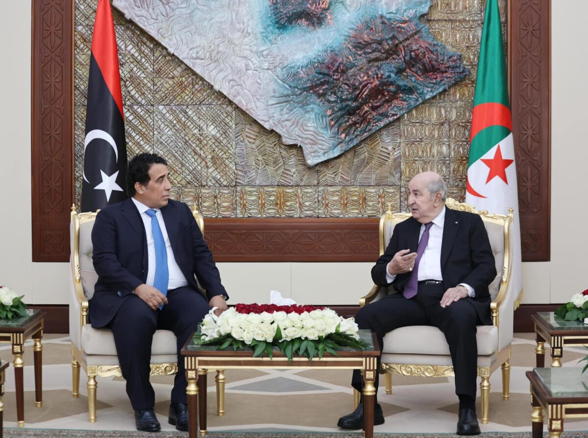 وبحث اللقاء، “سُبل تعزيز العلاقات الثنائية الأخوية بين البلدين، والقضايا ذات الاهتمام المشترك، بالإضافة لعمق ومحورية العلاقات الاستراتيجية بين ليبيا والجزائر، لاسيما في ظل التهديدات التي تواجه المنطقة، وأهمية مواصلة التنسيق والتعاون لتجاوز المرحلة الدقيقة الحالية التي تمر بها المنطقة العربية والعالم الإسلامي، وفي مقدمتها القضية الفلسطينية”.
