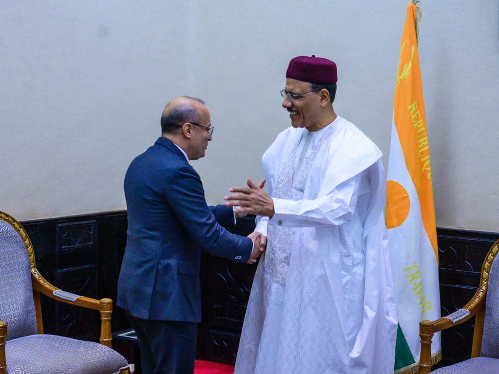 استقبل رئيس جمهورية النيجر محمد بازوم، بقصر الرئاسة في العاصمة نيامي، النائب بالمجلس الرئاسي عبد الله اللافي، الذي يشارك في القمة الاستثنائية للاتحاد الإفريقي حول التصنيع والتنويع الاقتصادي في إفريقيا، والدورة الاستثنائية حول منطقة التجارة الحرة القارية.