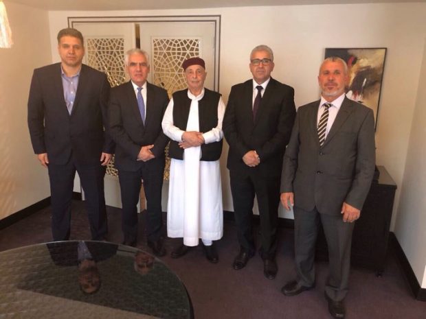 رئيس مجلس النواب «عقيلة صالح» يلتقي بمجموعة من نواب مصراته المقاطعين في المغرب.