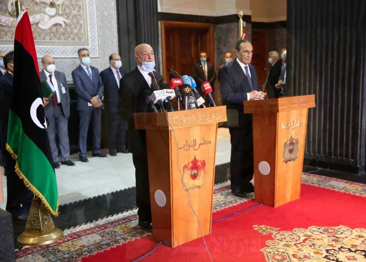 وأكد عقيلة صالح، في مؤتمر صحفي عقده مع نظيره المغربي عقب لقائهما، على العلاقات القوية الدائمة والمستمرة بين الشعبين الشقيقين والتواصل المستمر بين مجلس النواب الليبي والمغربي وذلك للتعاون والتشاور المستمر من أجل الوصول إلى حل للأزمة الليبية.