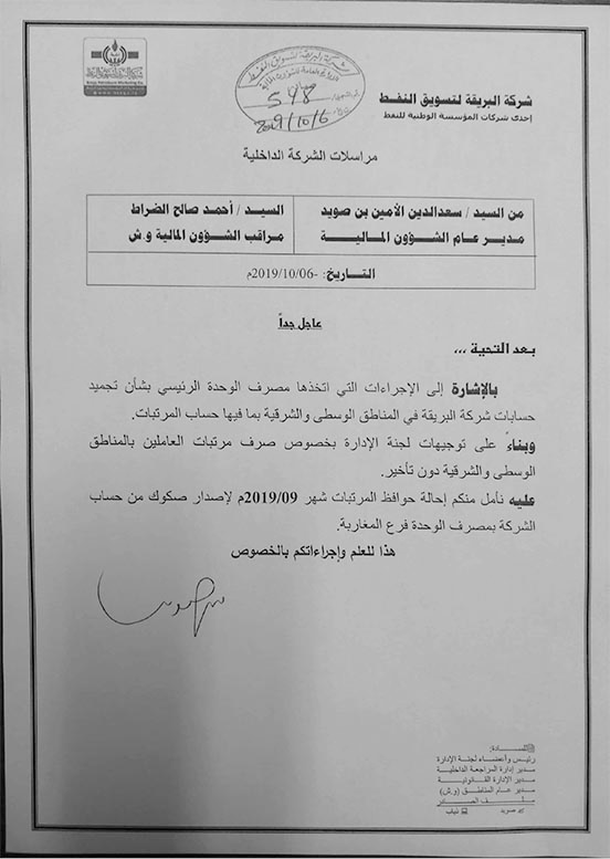“سنقوم بتسديد مرتبات جميع موظفينا في أقرب وقت ممكن، لقد تم بالفعل دفع رواتب الموظفين في جميع مناطق ليبيا الأخرى دون تأخير، إلا أن مجلس إدارة الجسم الموازي قد امتنع عن إحالة حوافظ مرتبات شهر سبتمبر لموظفي المناطق الوسطى والشرقية إلى إدارة الشركة بطرابلس ليتم سدادها”.
