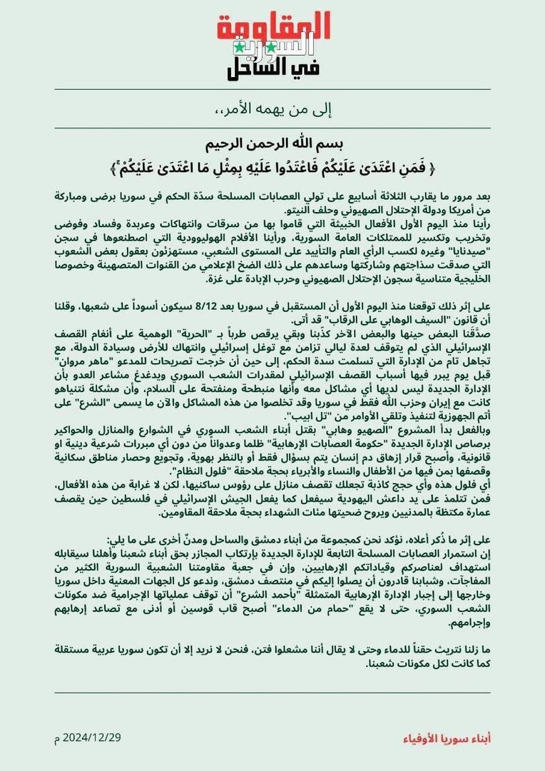 أصدرت مجموعة تطلق على نفسها “المقاومة السورية في الساحل” تضم أفرادا من دمشق والساحل ومدن أخرى، بيانا يطالب السلطات السورية الجديدة بوقف “الانتهاكات” تفاديا لوقوع حمام دم في البلاد.