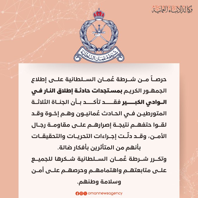 قالت شرطة سلطنة عمان، “إن الجناة الثلاثة المتورّطين في واقعة إطلاق النار على مسجد قرب العاصمة مسقط، عُمانيون”.