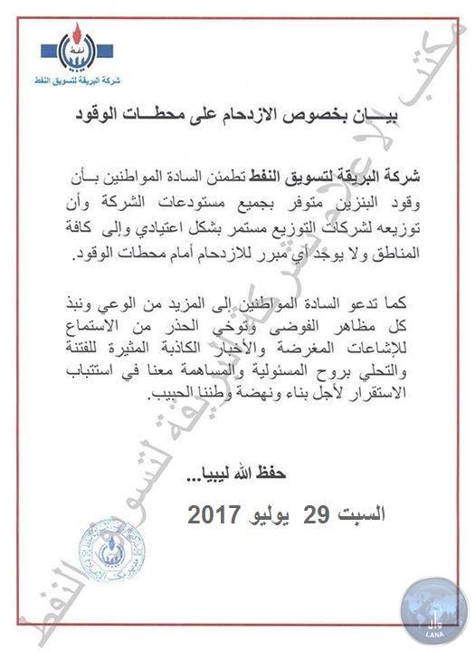 أكدت شركة البريقة لتسويق النفط توفر مادة البنزين في كافة المحطات العاملة بطرابلس و ضواحيها ،حيث دعت المواطنين إلى عدم الإزدحام أمام المحطات.