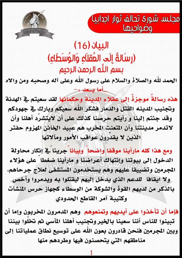 أصدر مجلس شوري تحالف ثوار اجدابيا وضوحيها اليوم الأربعاء، بياناً وجه فيه رسالة إلى عقلاء وحكماء مدينة اجدابيا لبذل الجهود المتواصلة والسعي لتجنيب المدينة القتال والدمار، والحرص على عدم تشريد أهالي المدينة.