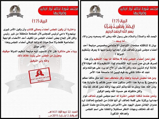 وأعتبر الناطق باسم المجلس، عبدالله المغربي، ما قام به أحد أعضاء مجلس شورى تحالف ثوار اجدابيا بمبايعته لـ”تنظيم الدولة”، أنه تصرف فردي، وأنهم أمهلوا من قام بهذا الفعل ثلاثة أيام ليوضح الموقف الصادر عنه إلا أنهم لم يتمكنوا من معرفة صحة الأمر منه.