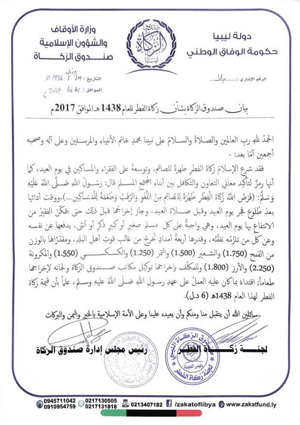 أعلن صندوق الزكاة التابع لوزارة الأوقاف بحكومة الوفاق الوطني، اليوم الاربعاء، عن تحديد قيمة زكاة الفطر للعام 1438 هـ/2017 م، مقدرا إياها بـ6 دينار ليبي.