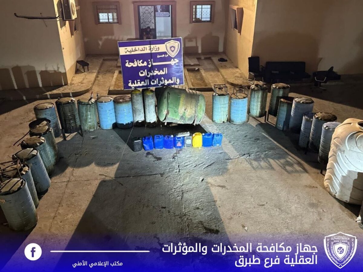 وأوضح المكتب الإعلامي للجهاز في بيان له، :أن عناصر فرع الجهاز بمدينة طبرق تمكنوا خلال عملية مداهمة للوكر من ضبط شخصين ومصادرة أربعة وعشرين ألف لتر من الخمور المحلية المعدة للبيع”، مشيرا إلى “اتخاذ الإجراءات القانونية مع المقبوض عليهم وإحالتهم لجهات الاختصاص”.