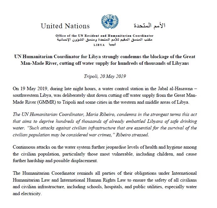 هذا وأدانت منسقة الشؤون الإنسانية في ليبيا نائبة الممثل الخاص “ماريا ريبيرو” بشدة إيقاف ضخ مياه النهر الصناعي، مما أدى إلى قطع إمدادات المياه عن مئات الآلاف من الليبيين.