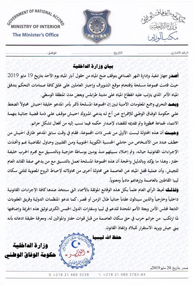 من جهتها أيضًا اتهمت وزارة الداخلية التابعة لحكومة الوفاق، خليفة حفتر بالتنسيق مع المجموعة المسلحة التي أغلقت صمامات التحكم بتدفق مياه النهر ووقف المياه عن طرابلس وبعض مدن المنطقة الغربية.
